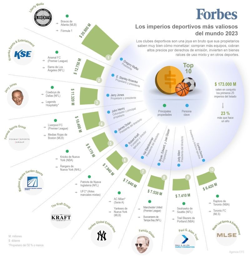 Liberty Media se encuentra en la cima del ranking de FORBES. Encabezado por el multimillonario John Malone, los principales activos deportivos de Liberty son el circuito de carreras de autos de Fórmula Uno y el equipo Atlanta Braves MLB. Sus acciones cotizan en el NASDAQ pero no hay CEDEAR disponible en Argentina.